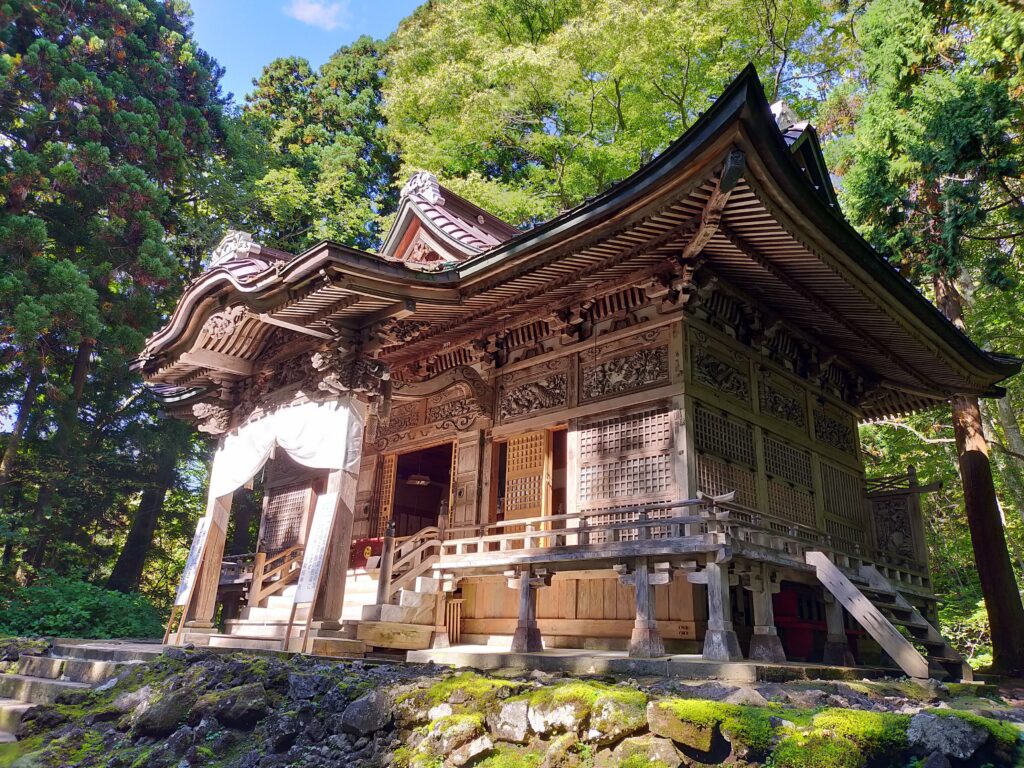 Towada Shrine is surrounded by ancient cedar trees, moss-covered stone steps, and is closely tied to local myths and mountain worship, creating a serene and mystical atmosphere.